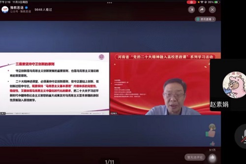 为了学习贯彻党的二十大精神以及习近平总书记视察陕西延安和河南安阳重要讲话精神,推动习近平新时代中国特色社会主义思想进教材、进课堂、进学生头脑,中共河南省委教育工委、河南省教育厅举办“党的二十大精神融入高校思政课”系列活动。2022年11月3日下午,马克思主义学院通过腾讯会议的方式学习了“党的二十大精神融入高校思政课”第一讲,主讲人为南开大学马克思主义学院寇清杰教授。