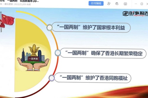 徐教授讲授的主题是“书写‘一国两制’实践新篇章”。他从举世公认的非凡成就、鉴往知来的深刻启示、由治及兴的光明前景三个方面进行了详细阐述。首先,徐教授从西方“唱衰”回归后的香港的预言被一一“打脸”的事例导入,引导学生思考“一国两制”所蕴含的政治智慧和现实威力。接着,他结合粤港澳大湾区建设、“爱国者治港”原则在香港落地生根等典型事例,全面准确阐释“一国两制”的深刻内涵,重点剖析了“一国两制”在香港的实践成功的原因。