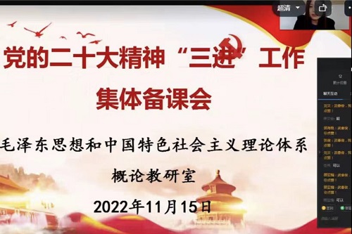 为深入贯彻学习党的二十大精神,把马克思主义中国化最新理论成果落实到思政课教学实践中,推动习近平新时代中国特色社会主义思想进教材、进课堂、进学生头脑,11月15日下午,“概论”教研室通过钉钉线上的方式组织开展了党的二十大精神“三进”工作集体备课会。会议由教研室主任武香俊主持,教研室所有教师参加。